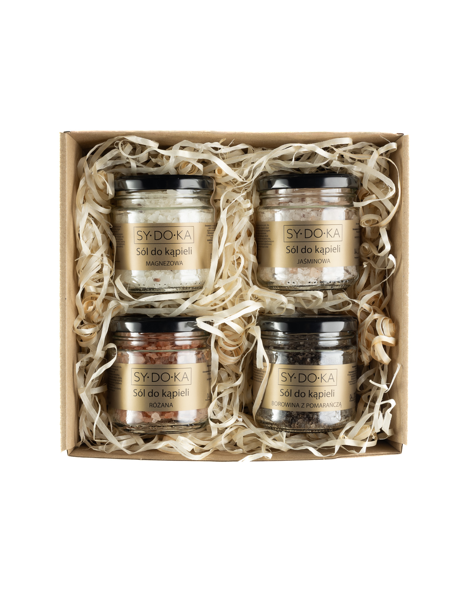 W zestawie znajdują się cztery rodzaje soli do kąpieli, dobrane tak, aby zapewnić dawkę minerałów i w zależności od potrzeby pobudzić lub wyciszyć organizm, np. po wyczerpującym pracą dniu poleca się kąpiel magnezową, natomiast w przypadku stresujących i obciążających nasz umysł zdarzeń poleca się kąpiel różaną lub jaśminową.